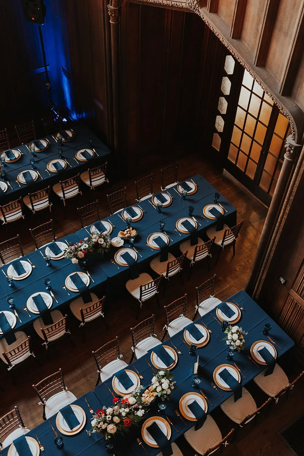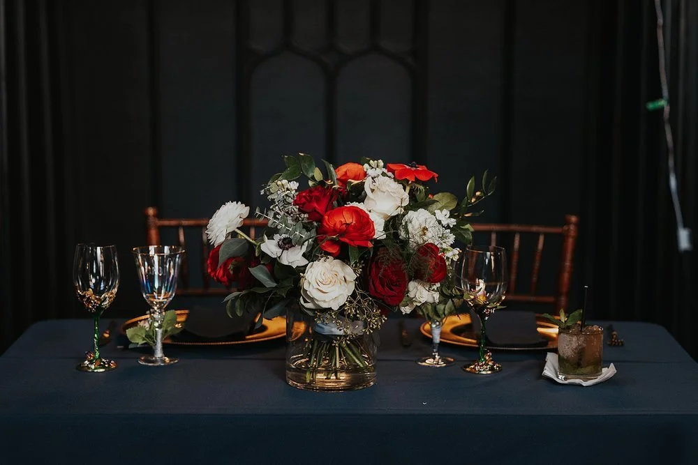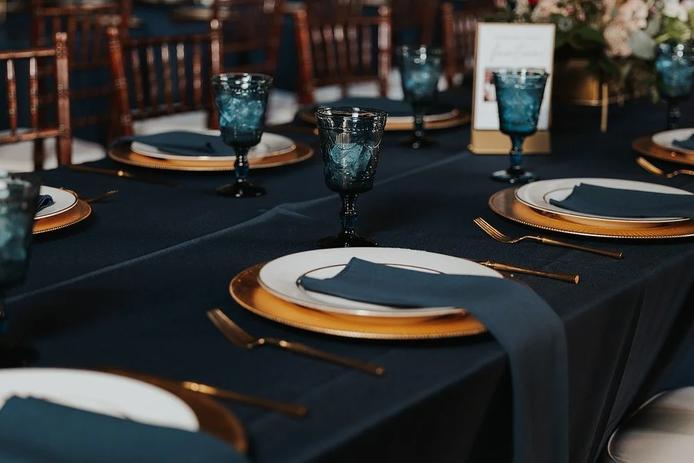 Set-up in long rows, the large dining tables were draped in deep blue tablecloths, creating a bold foundation for the table settings. Each place setting featured matching linen napkins and gold-rimmed plates, exuding a luxurious and sophisticated look (all rentals by: Chairs for Events). Centerpieces, again featured by H&J Flowers, were lush, overflowing blooms in deep reds, blush pinks, and hints of blue echoing the ceremony’s floral arrangements. Housed in simple vases, the flowers brought a warm glow to the tables; delicate greenery softened the arrangements, adding texture and depth, while the deep hues contributed to the overall moody aesthetic.
