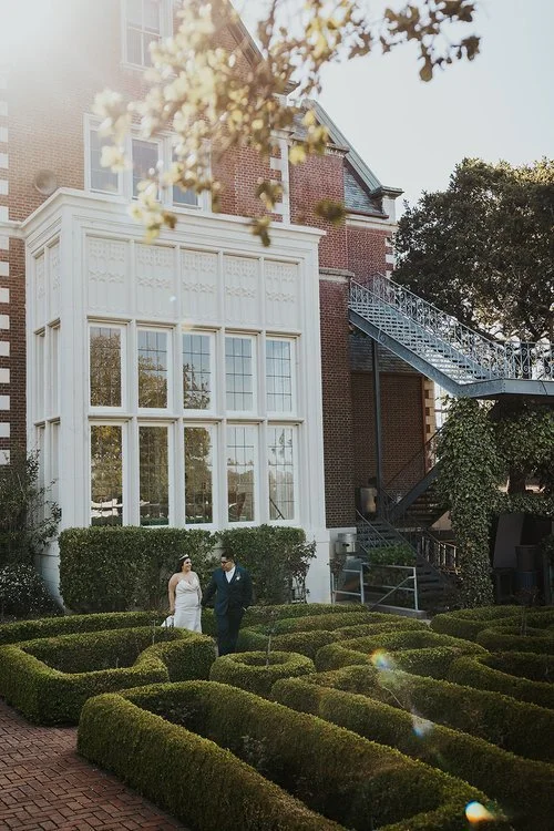 While guests enjoyed the cocktail hour, the couple made use of the mansion’s scenic grounds for their wedding photos, taking advantage of the lush hedges and ivy-covered staircases. The afternoon sunlight streaming through the leaves added a magical touch to their portraits, capturing the beauty of the venue and chic style of their wedding day.