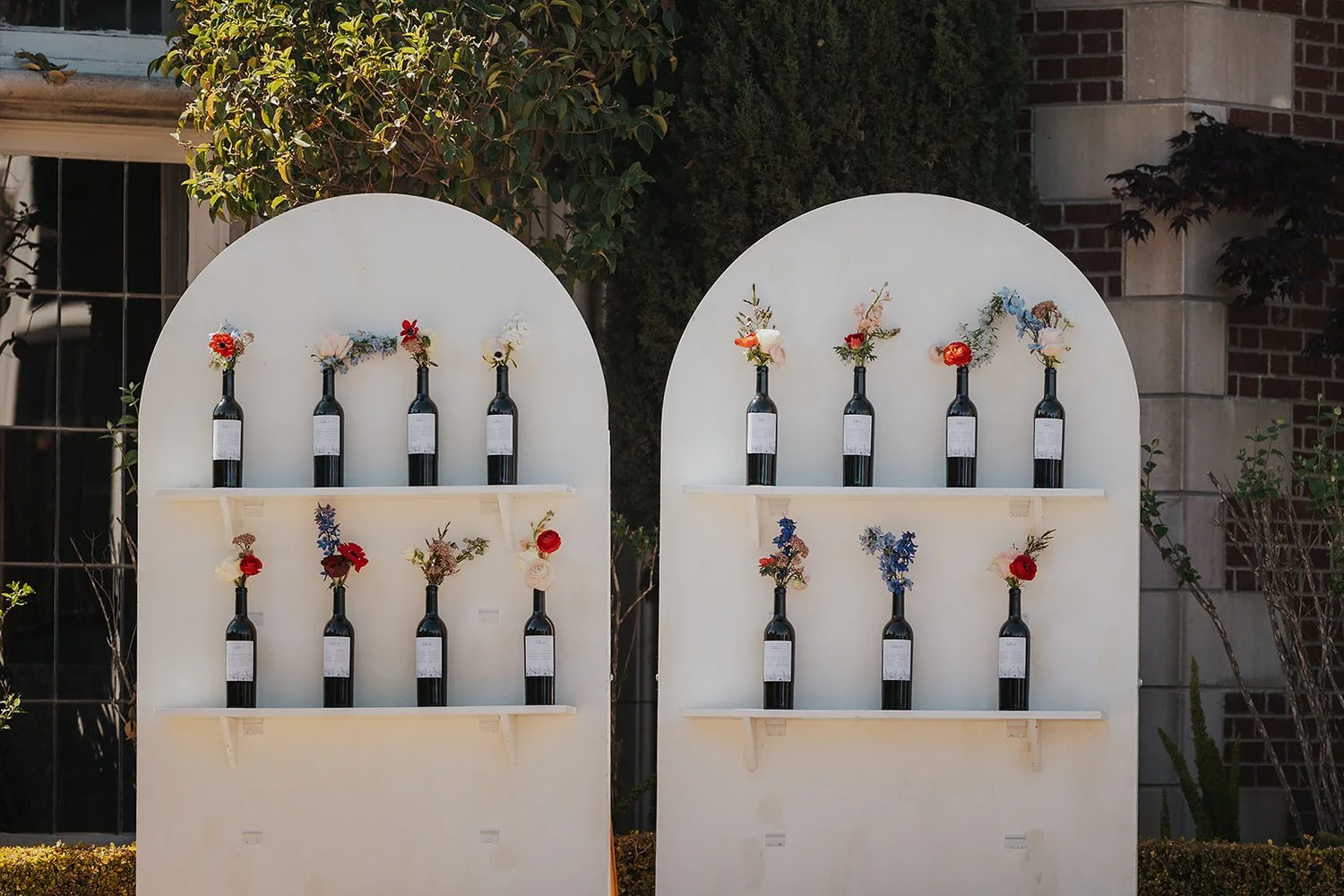 The ceremony took place on the mansion’s front lawn, framed by towering trees and vibrant greenery. To complement the outdoor setting, the floral arrangements by H&J Flowers were nothing short of breathtaking. Eye-catching red, blue, and blush blooms adorned the aisle, creating a striking contrast against the natural surroundings. A circular arch at the altar, draped in roses, delphiniums, and eucalyptus, provided an intimate and organic focal point for the couple’s vows. The floral palette, featuring deep reds, soft blushes, and pops of blue, introduced a moody yet romantic vibe that set the tone for the evening’s celebration.